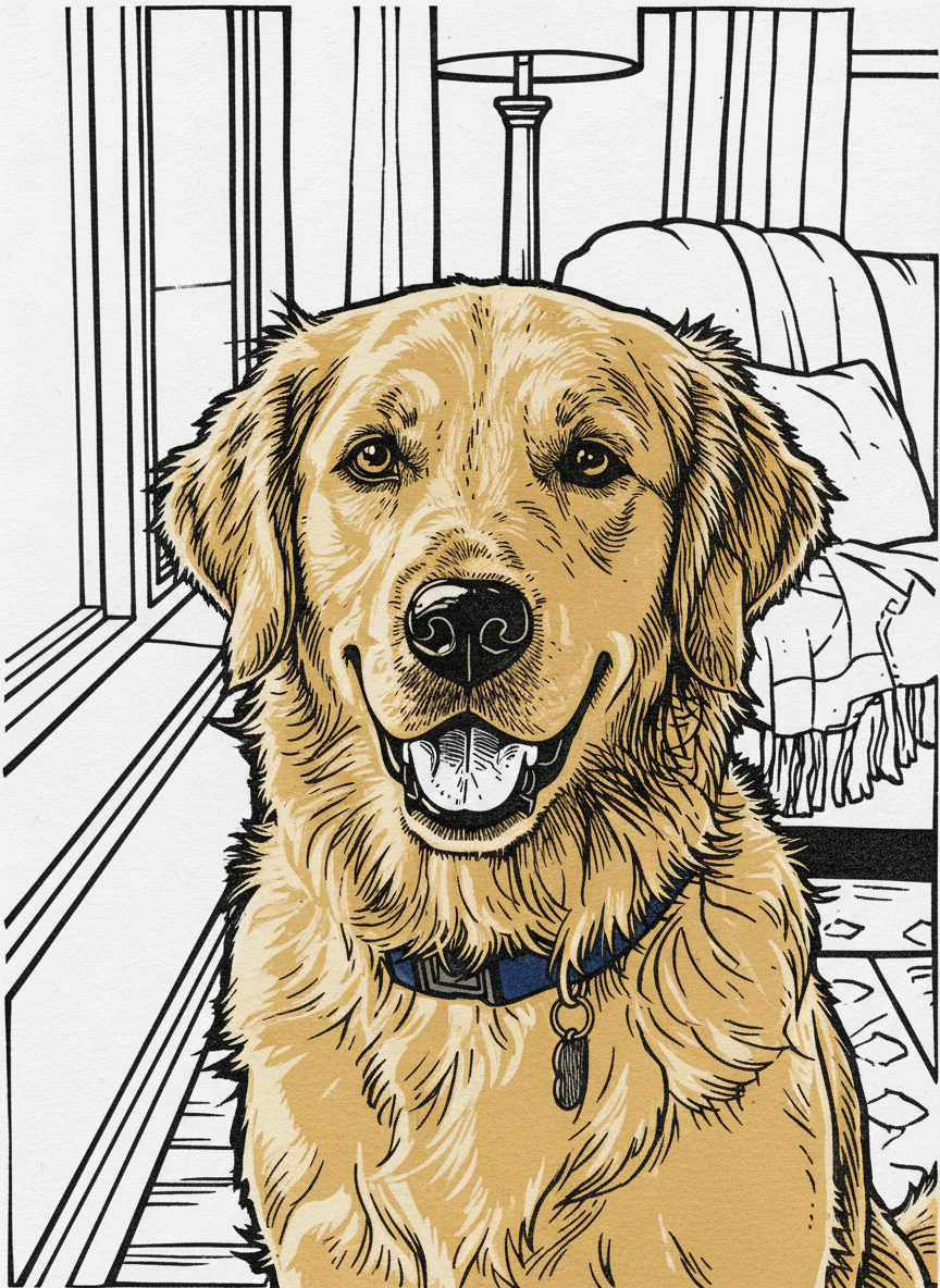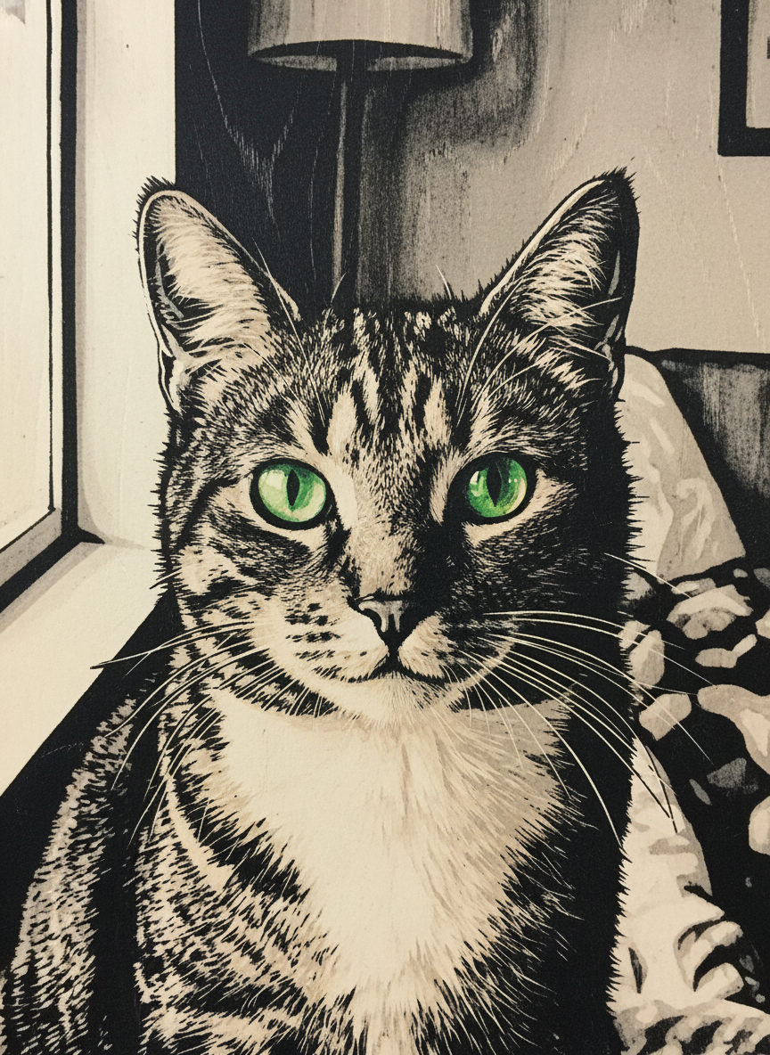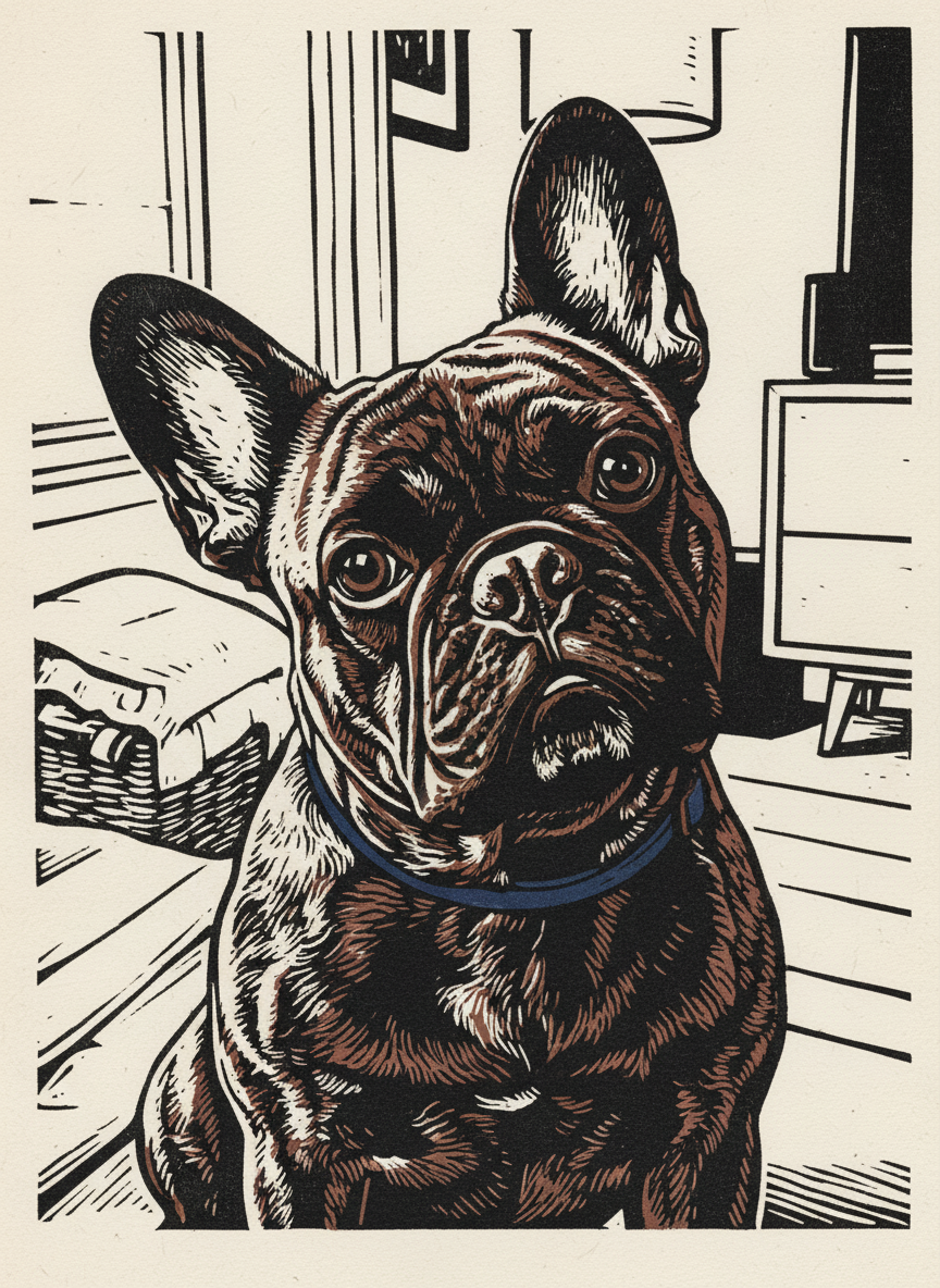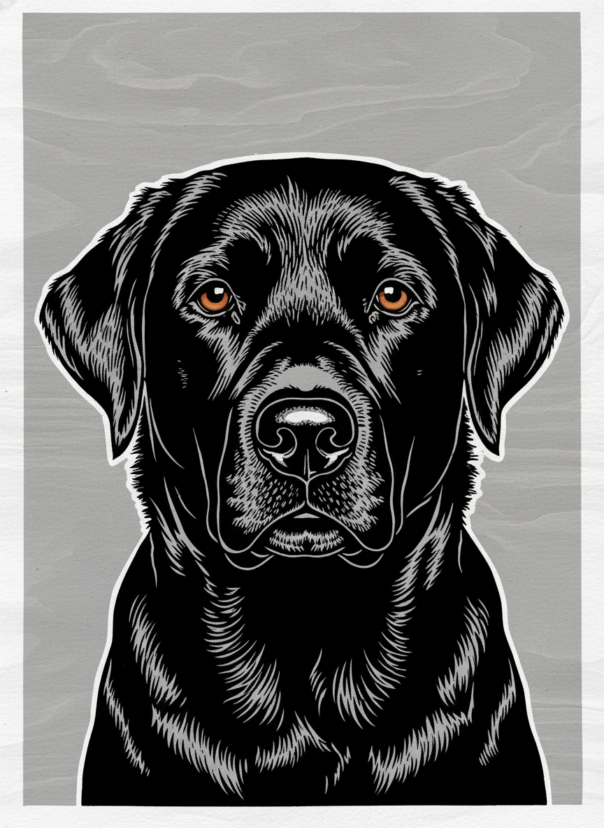 The woodcut has been around since the 9th century and has never once looked timid. Bold black lines, gouged edges, the slight roughness of ink pressed into paper — this is a medium that commits. Your pet rendered in the relief print tradition: high contrast, graphic, with the honest texture of a block that was physically carved by hand. Enduring is the word.