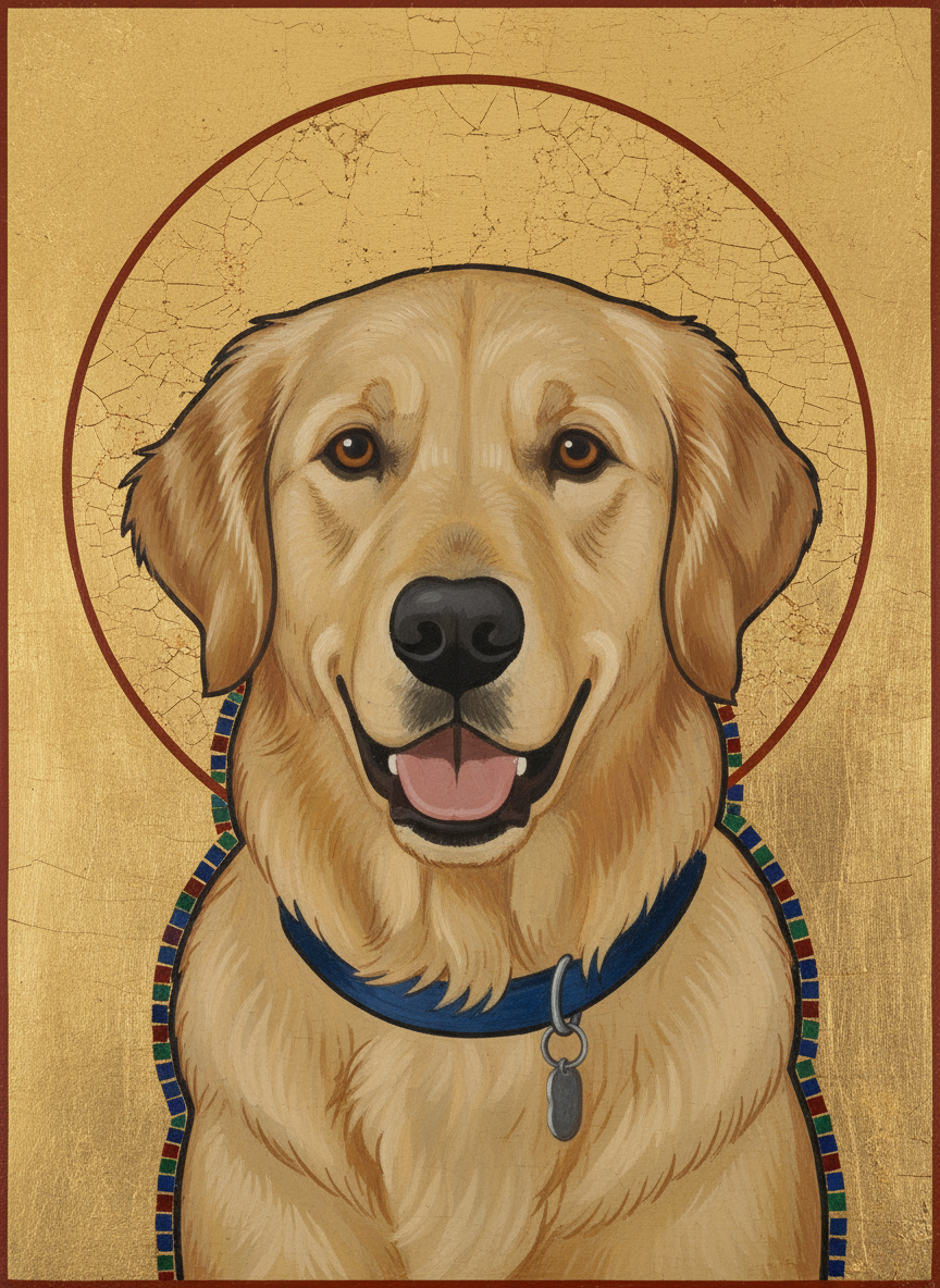 Gold background, solemn gaze, and a halo that says this pet transcends the mortal plane. The Byzantine Icon style draws from centuries of sacred mosaic and panel painting — flat, symbolic, and radiating a quiet, golden reverence. Religious art without the religion. Just the awe.