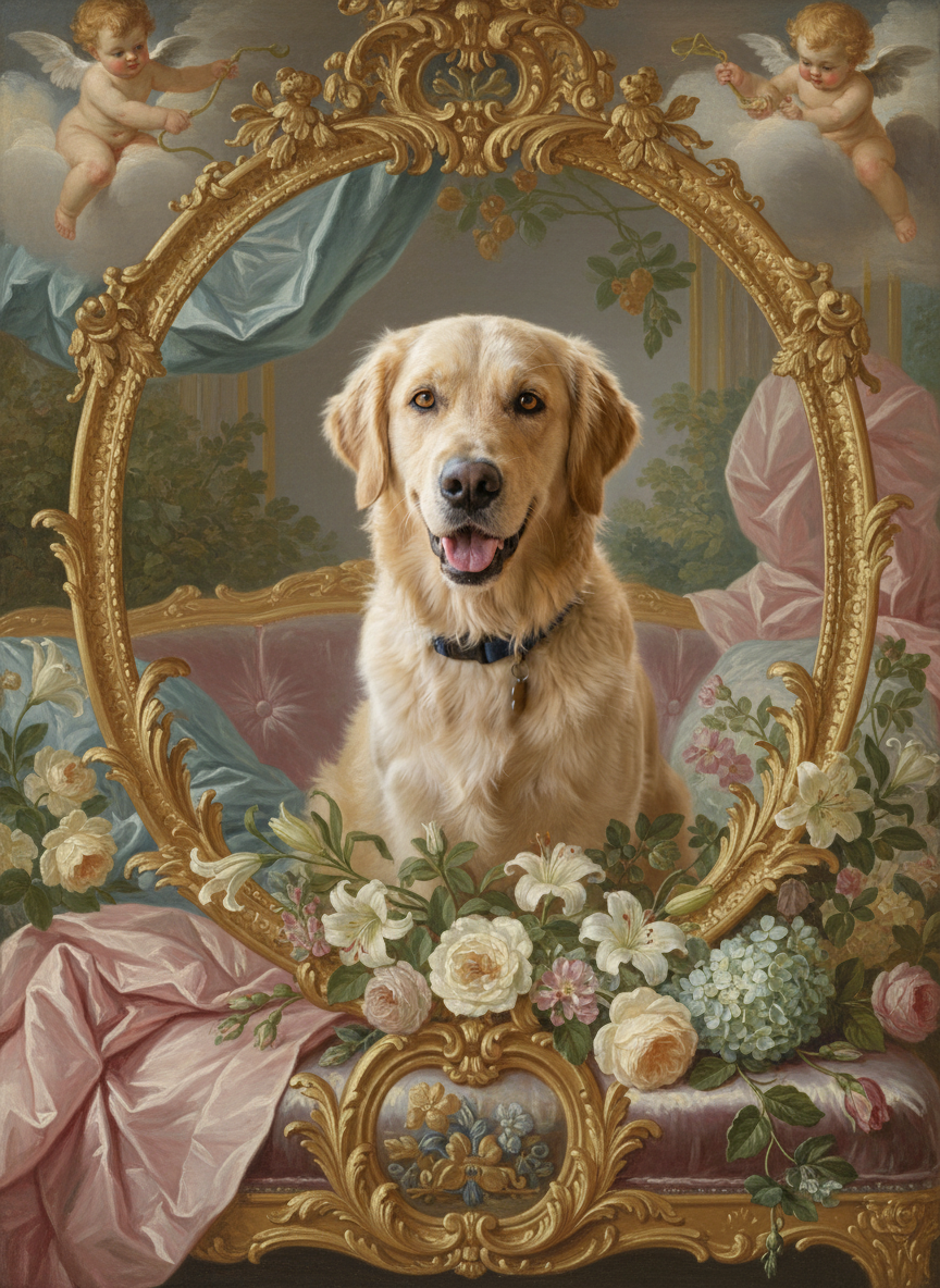Pastel skies, gilded flourishes, and the unapologetic indulgence of 18th-century French aristocracy. Lighthearted, ornamental, and just a little bit ridiculous — in the best way. Think Fragonard, think Boucher, think powdered wigs and perfumed gardens. Your pet, living their most extravagant life in a cloud of pink and gold.