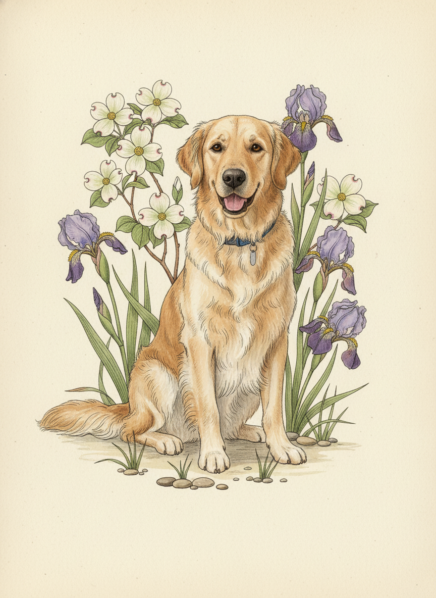 Your pet, centered and precisely rendered, surrounded by detailed flora — as if a natural history illustrator turned their meticulous eye from birds and orchids to the most important species in the room. Inspired by Audubon, Merian, and Redoute. Annotated, classified, and utterly gorgeous.