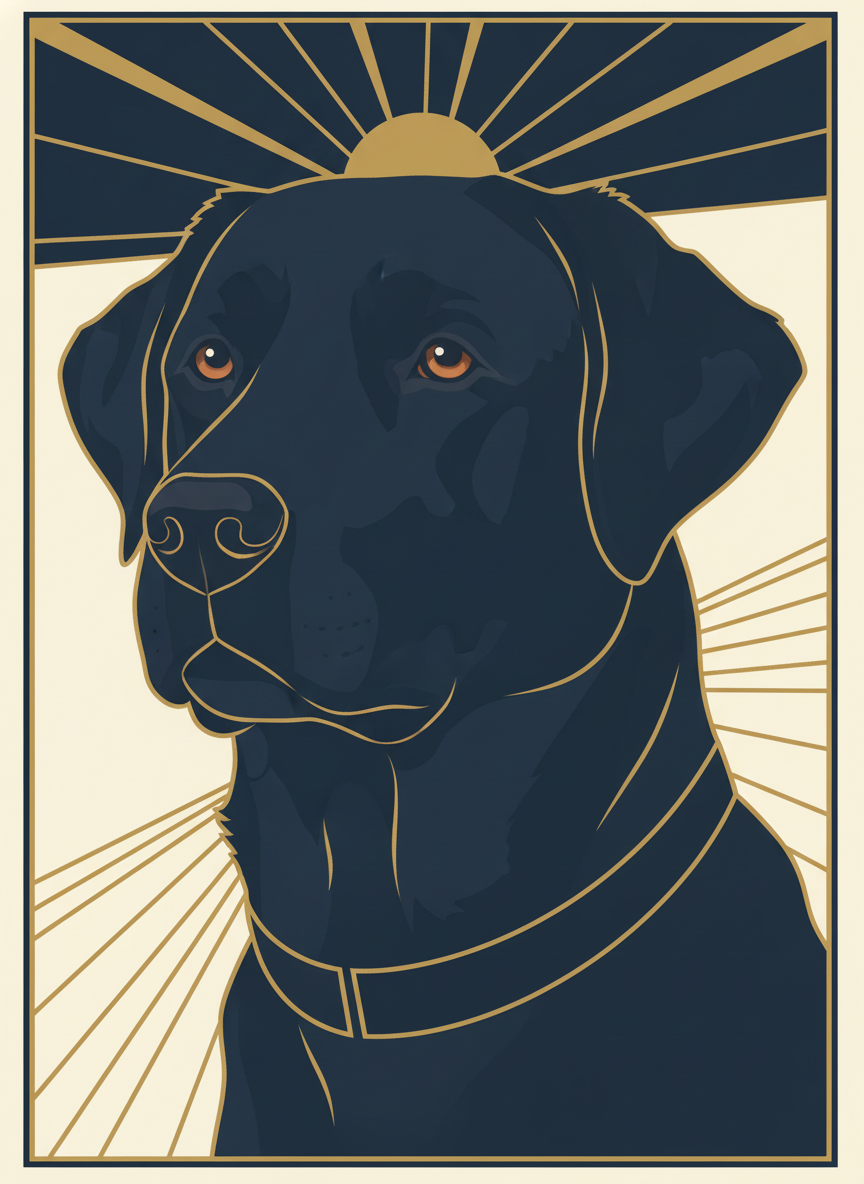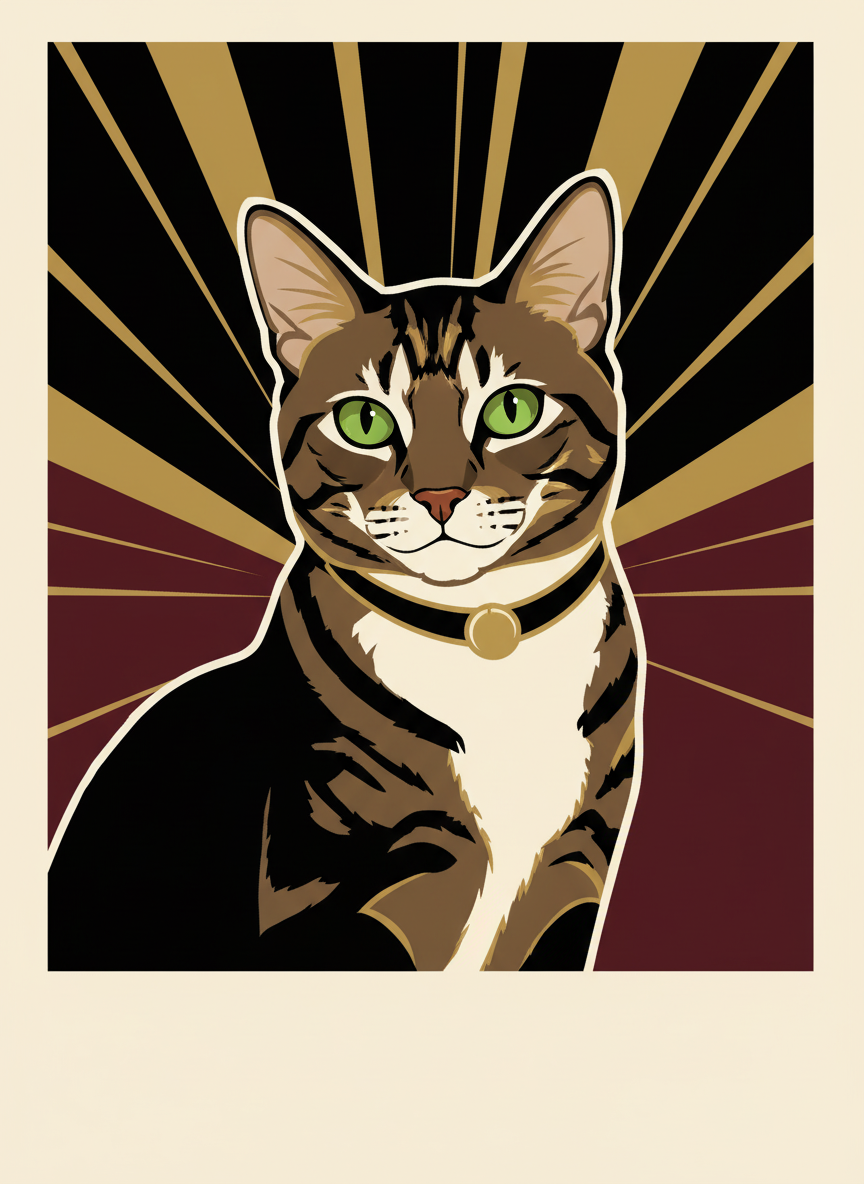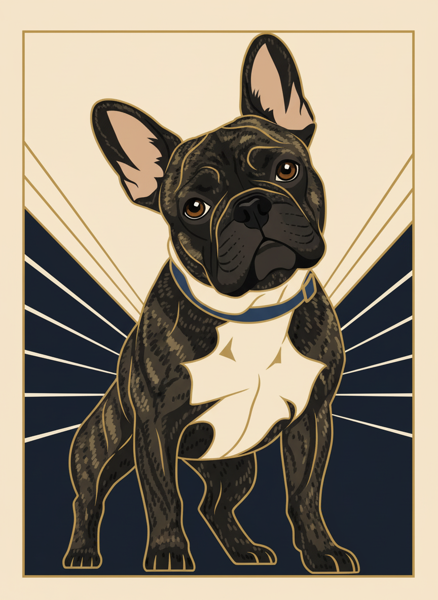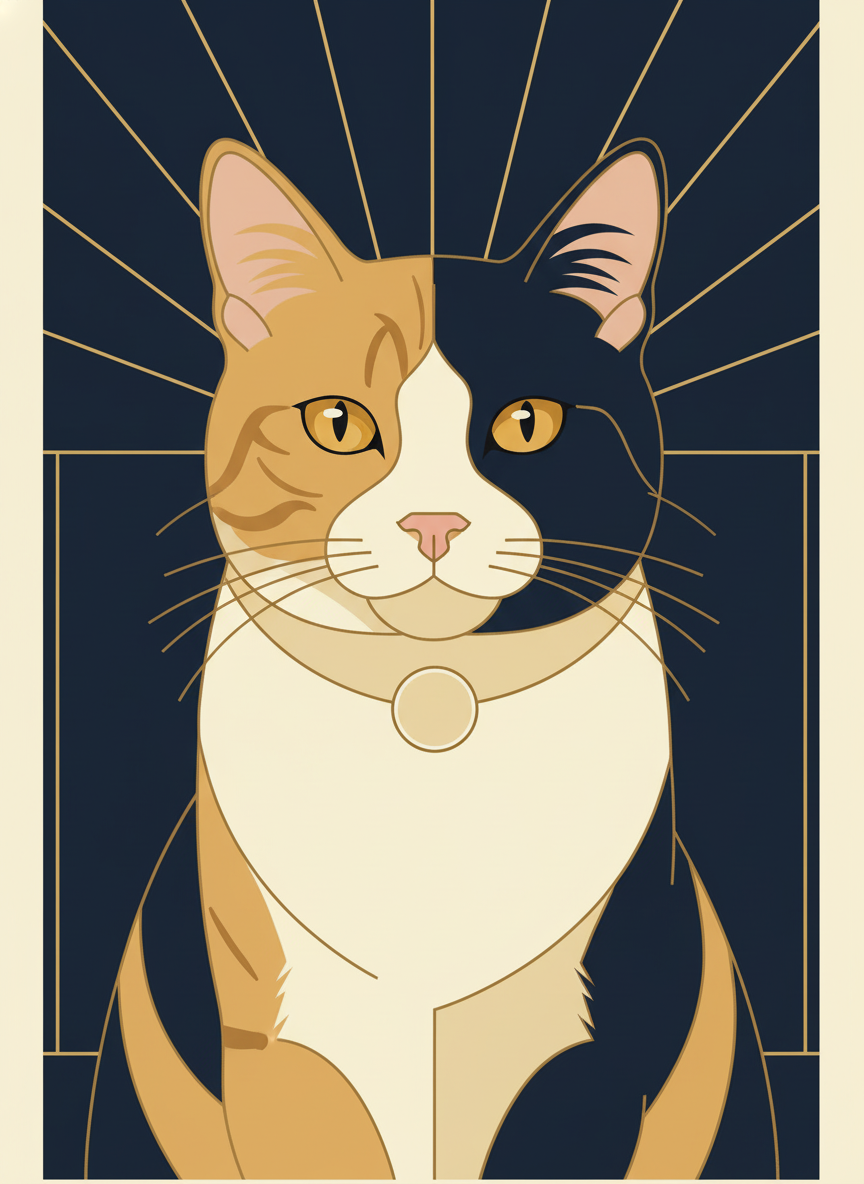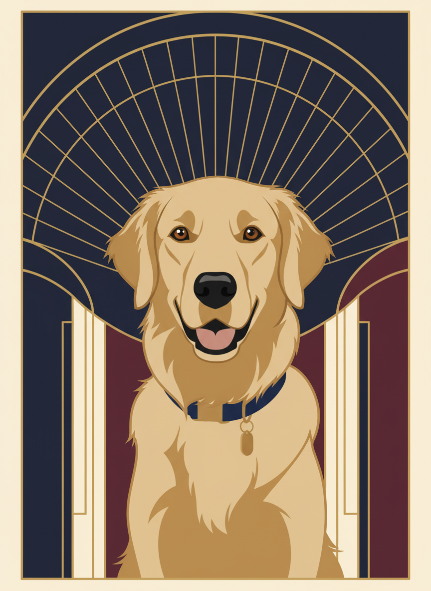 Art Deco was the style that decided the future would be elegant. Clean geometric lines, speed-suggesting forms, gold that didn't apologize for itself. Cassandre made posters for ocean liners and trains — objects of tremendous velocity and purpose. Your pet, rendered in that same language of streamlined confidence. The elongated proportions. The gold. The sense that this animal is going somewhere important.