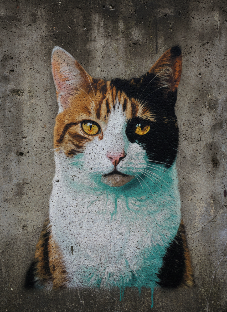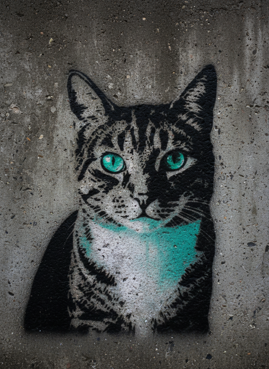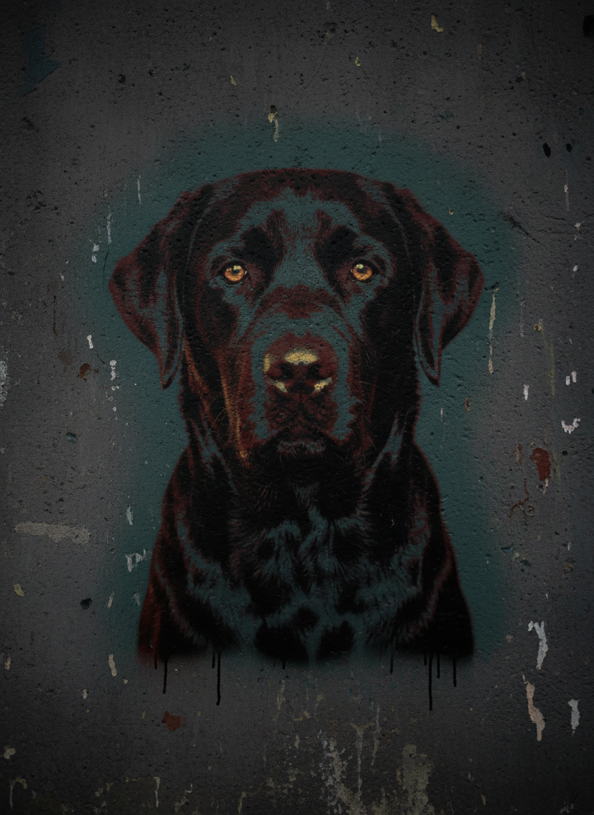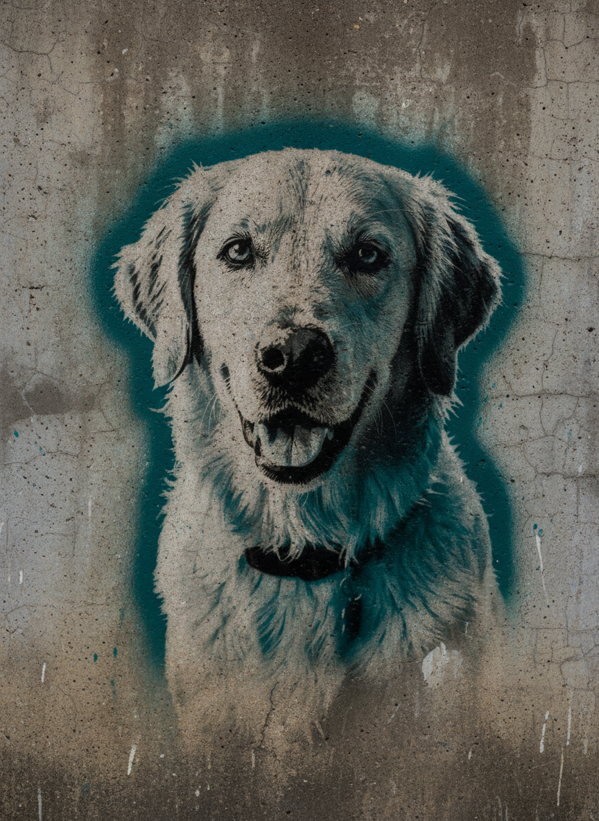 Banksy's power was never about the spray paint. It was about the audacity of treating the street as a gallery and finding the absurd in the serious. Your pet rendered in that same high-contrast stencil language — two colors, one strong idea, the kind of image you'd stop and photograph on a Bristol wall. The joke is that it's serious. The serious part is that it's art.
