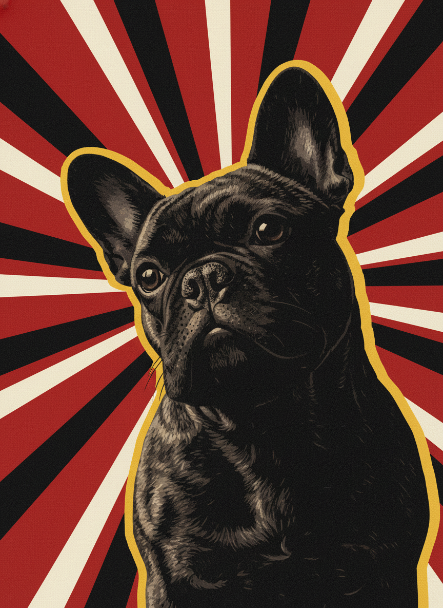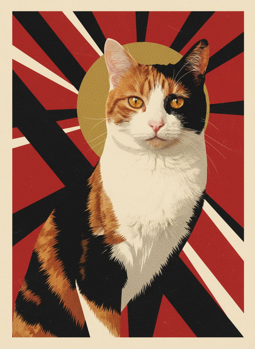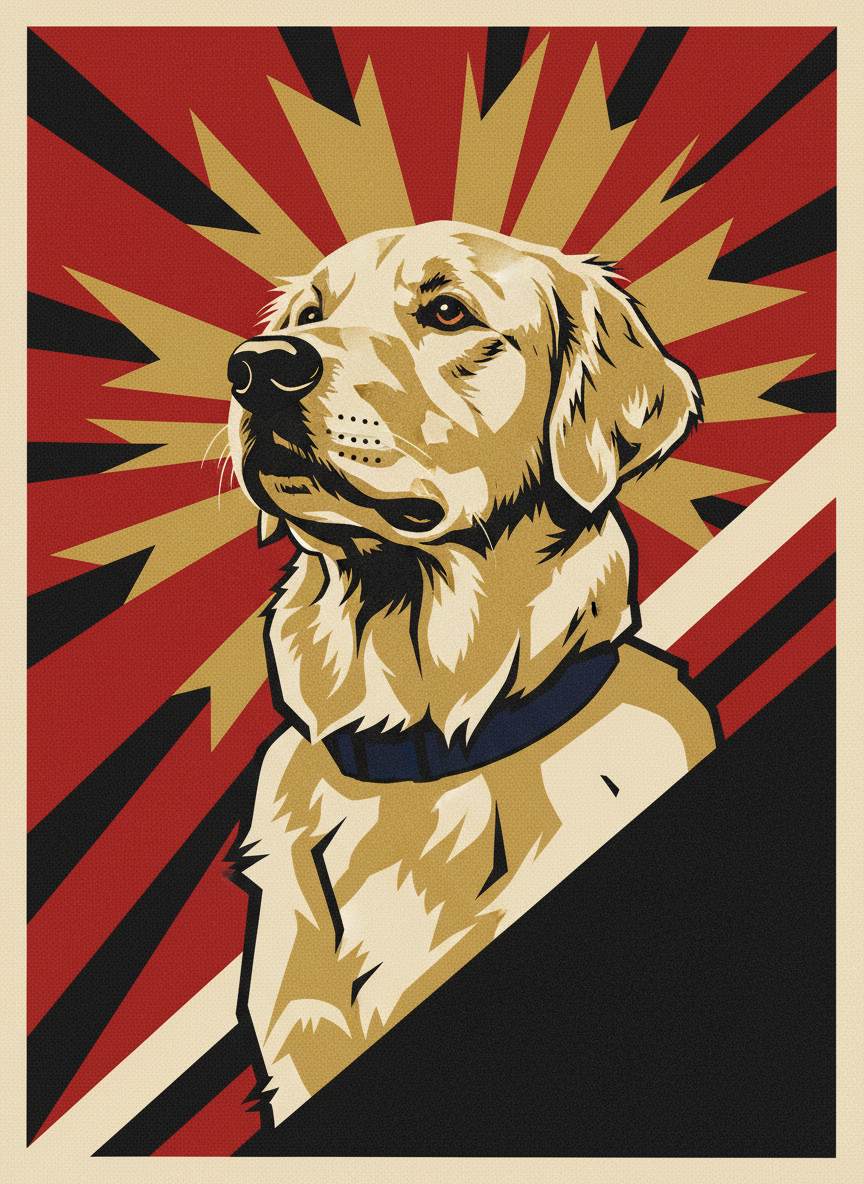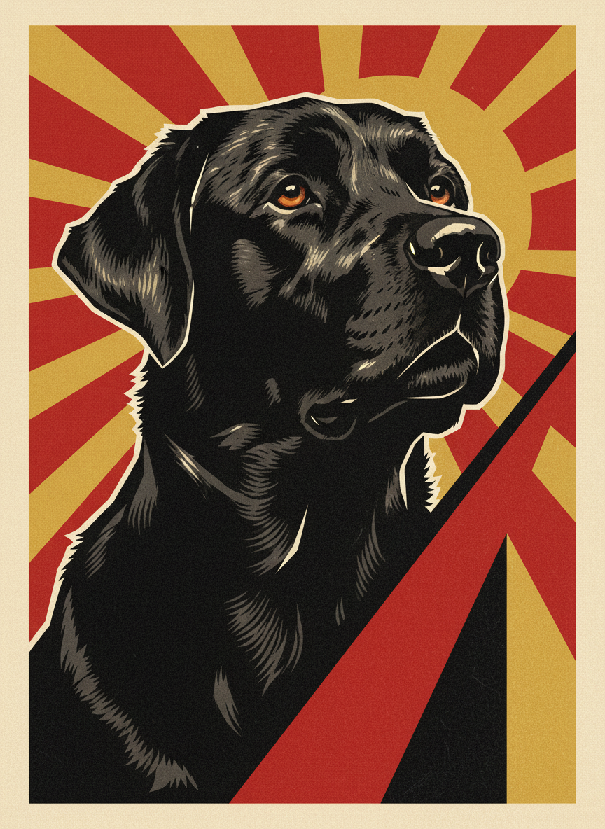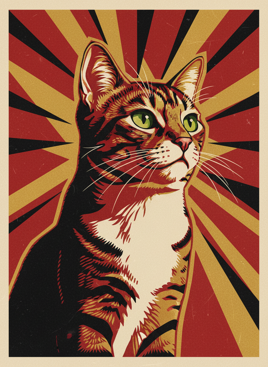 The constructivists believed that bold graphic design could change the world. Red. Black. Gold. A diagonal that never lets your eye rest. Your pet elevated to the status of a revolutionary hero — which, if you think about it, is probably appropriate. Rendered in the stark graphic language of Soviet propaganda, because some subjects demand it.