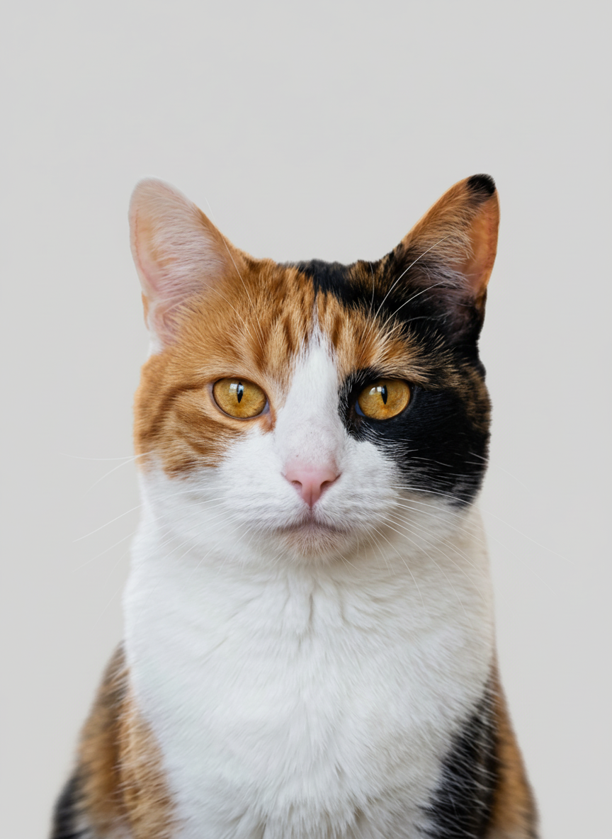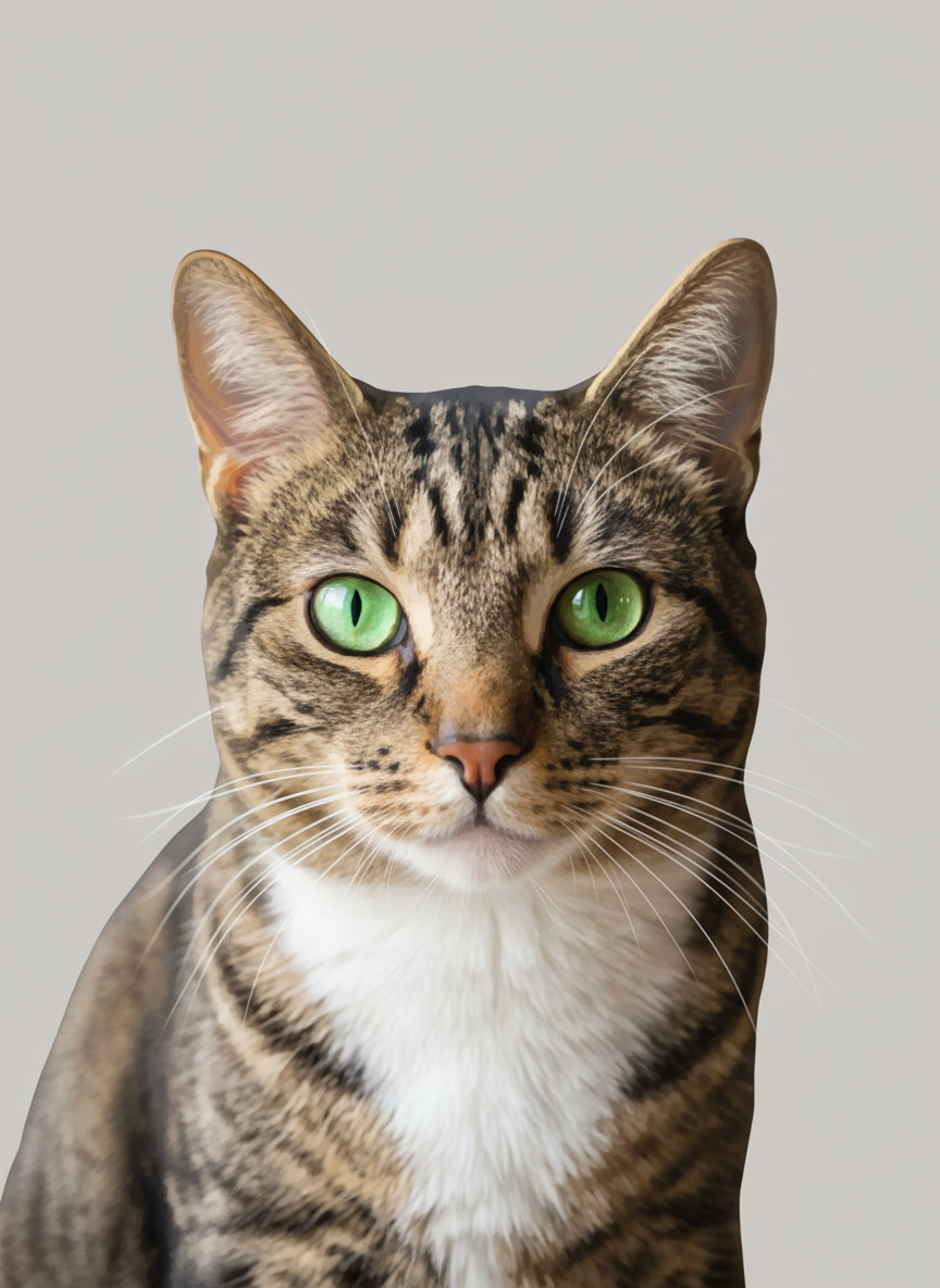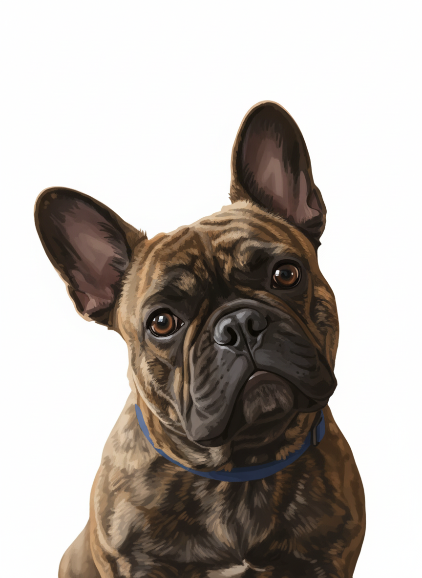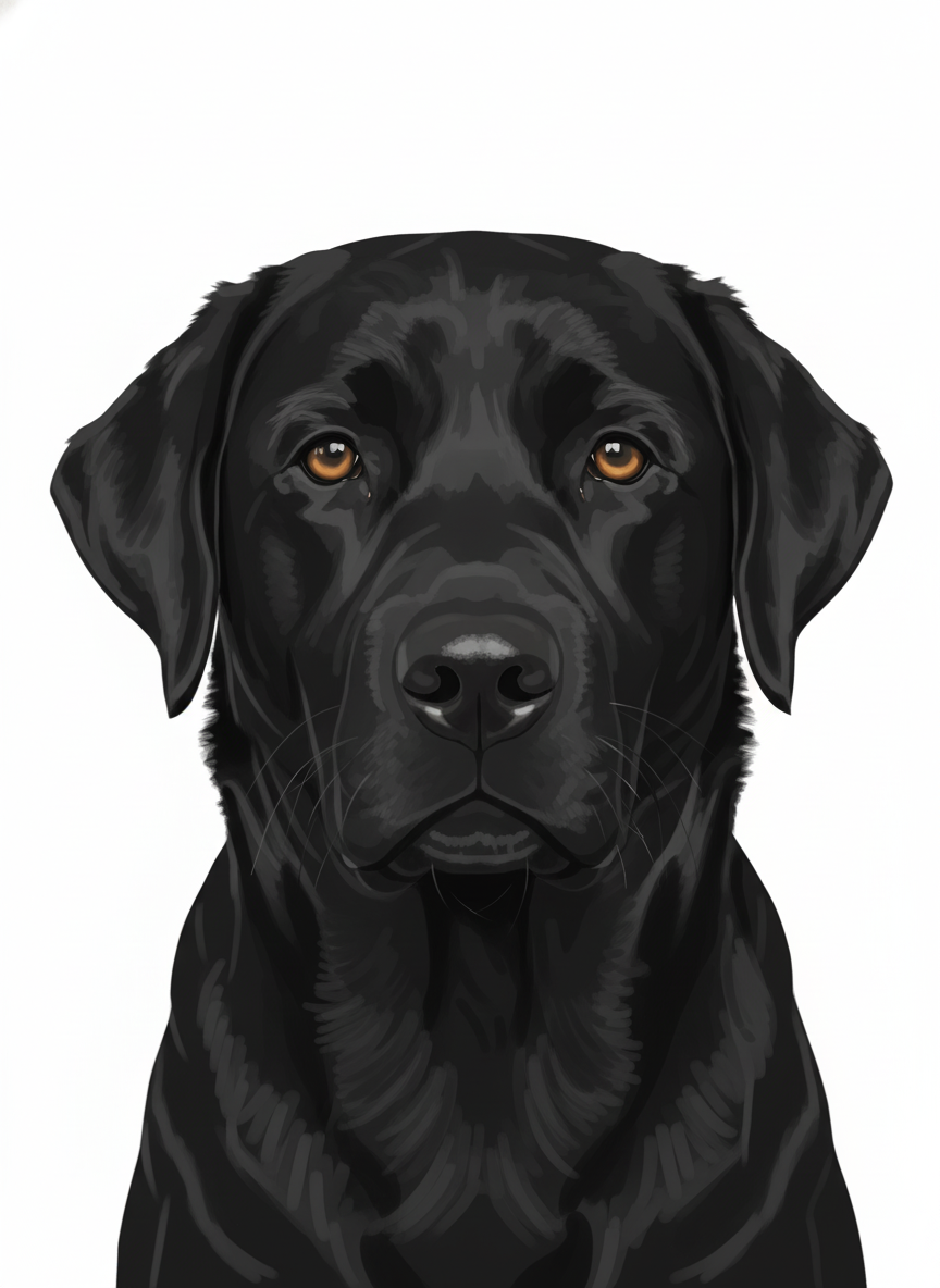 Clean. White. Centered. Your pet rendered as a smooth digital illustration against nothing — which turns out to be a very strong compositional choice. The head from the bottom third, the face in full, the space above left deliberately open. The kind of piece that works as well on a gallery wall as it does above a desk. Simple doesn't mean small.