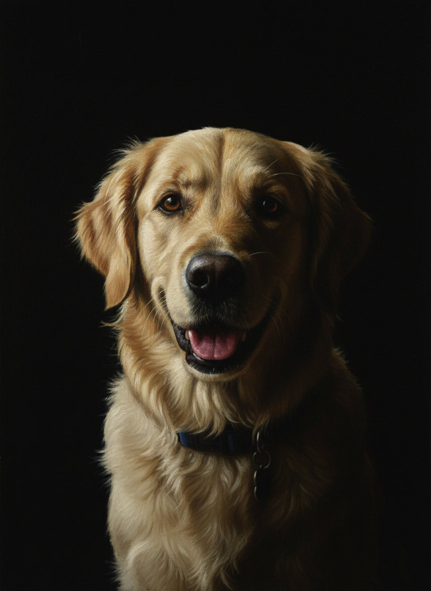 Extreme contrast. Deep blacks cut by a single sharp light. If Rembrandt whispered with shadow, Caravaggio shouted. This is our most dramatic Old Master style — theatrical, almost cinematic, with a tension that makes the piece feel like something is about to happen. Your pet, captured at the most interesting moment in art history.