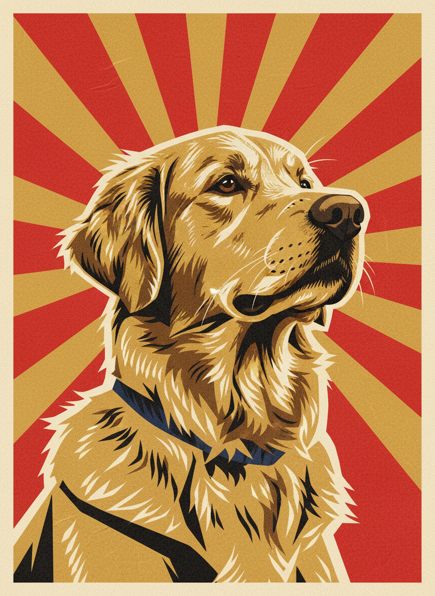 Heroic upward angle. Red and gold. The bold, flat graphics of a revolution — just pointed at a much better cause. Your pet as a worker-hero, a comrade of the highest order, rendered in the striking constructivist aesthetic that made ordinary people look like monuments. Your pet was already a monument. Now it looks like one.