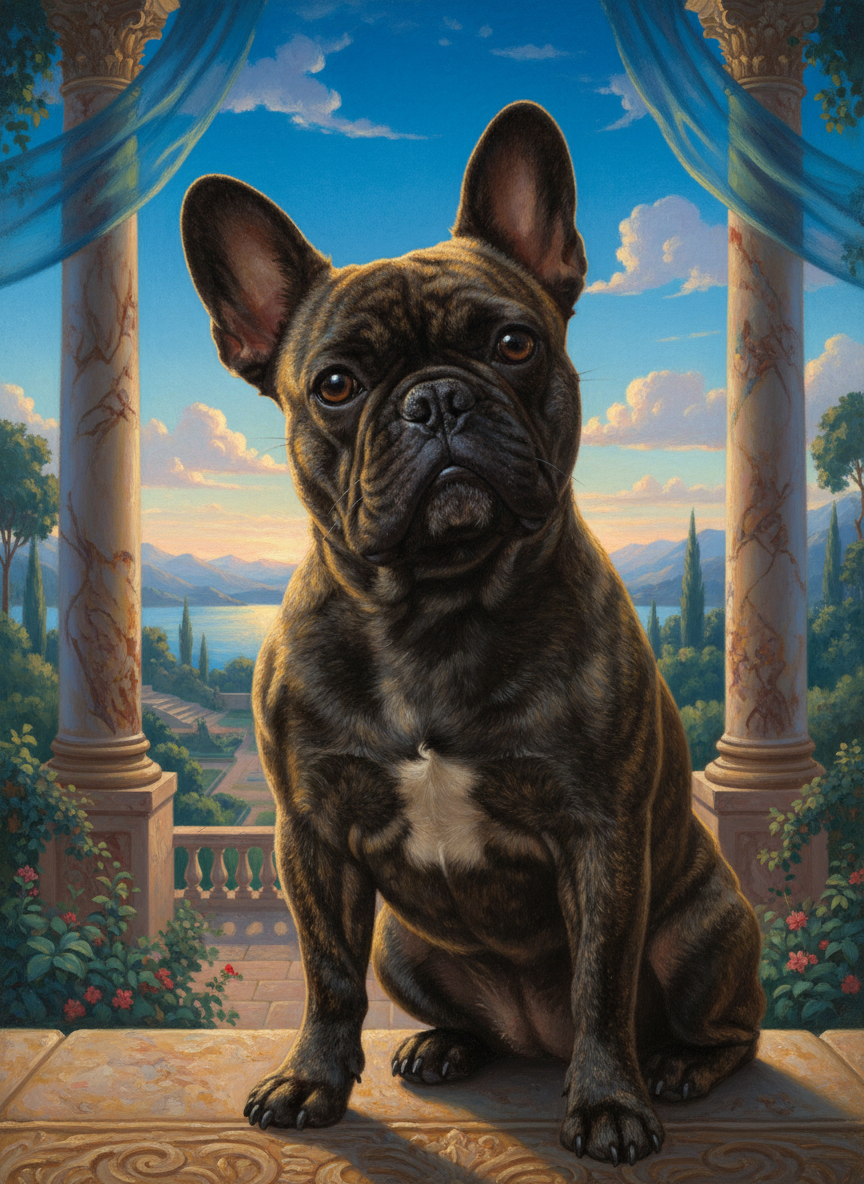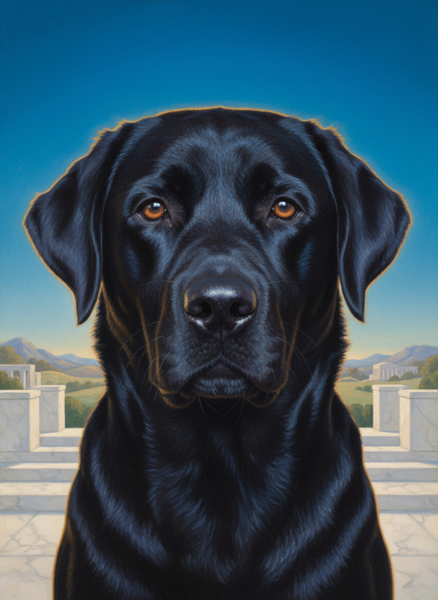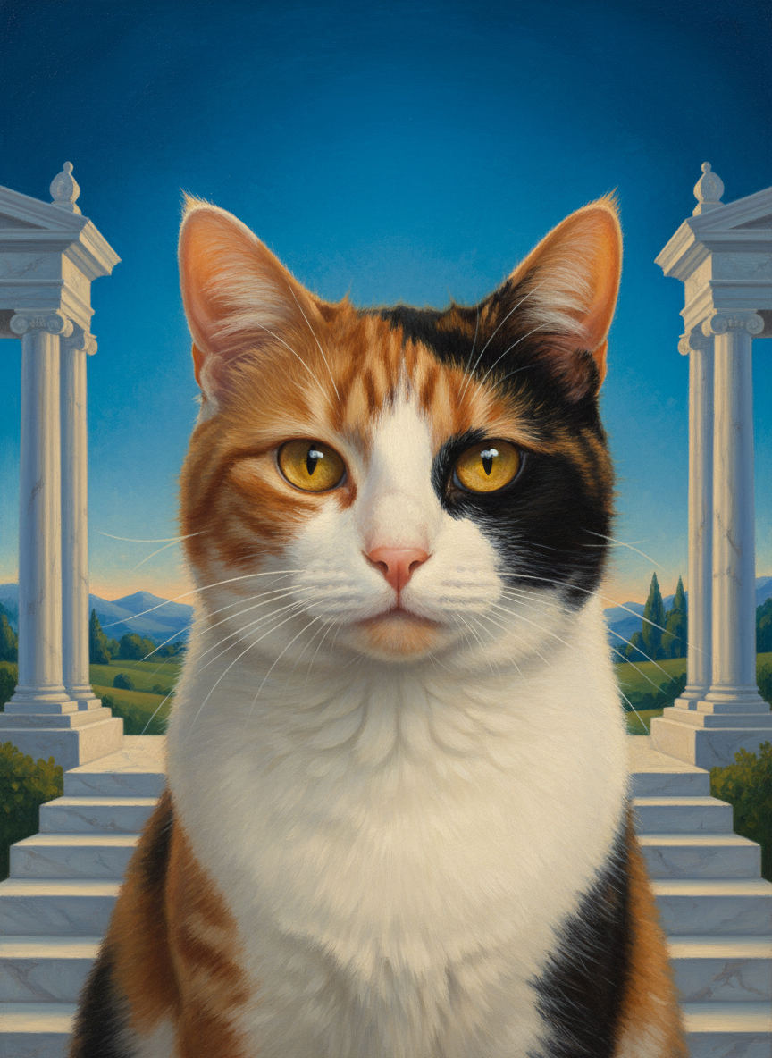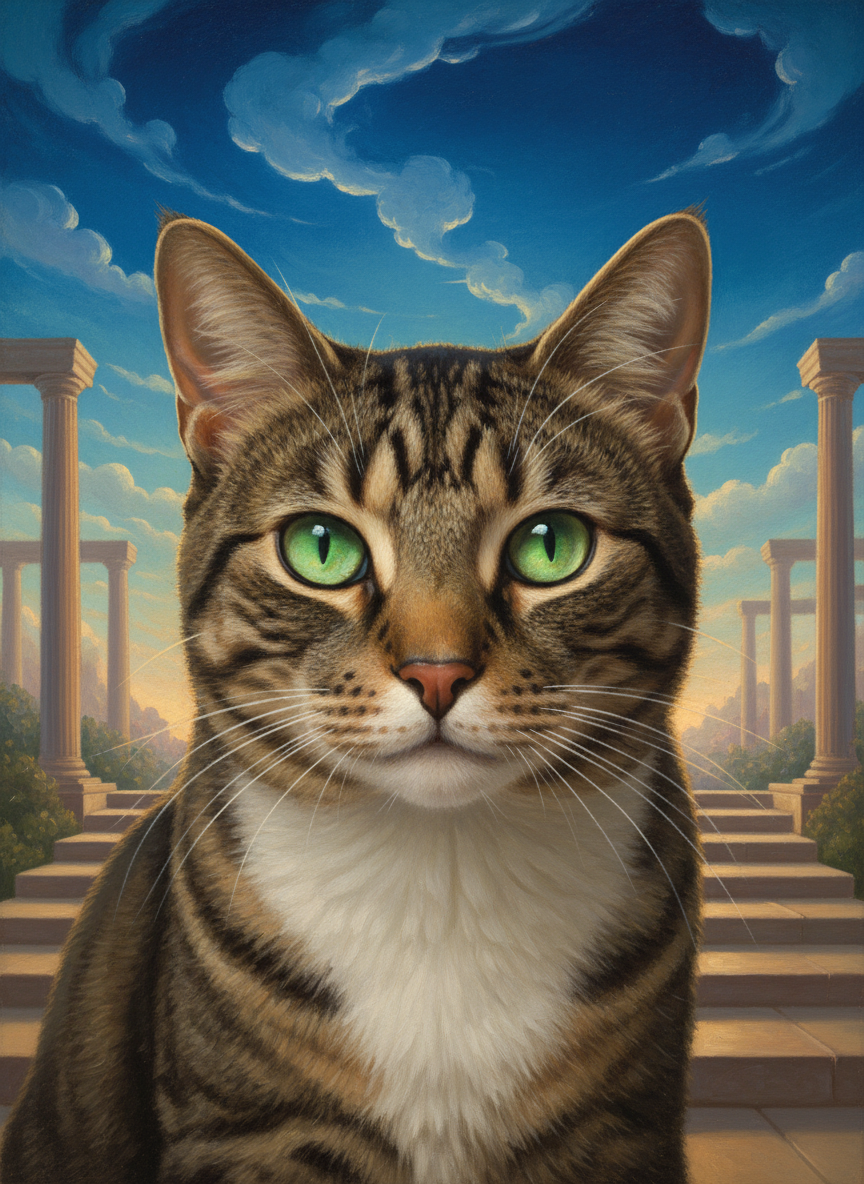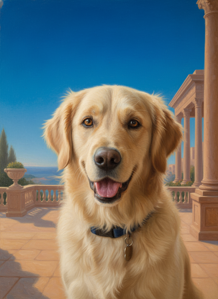 Maxfield Parrish had a color — Parrish Blue — a deep, luminous cerulean that shows up in virtually every canvas he painted. He also had a light: golden, warm, glowing from within, the kind of light that only exists in dreams and his paintings. Your pet placed in that world: luminous, idealized, bathed in the particular quality of light that makes everything look like a place you've always wanted to be.