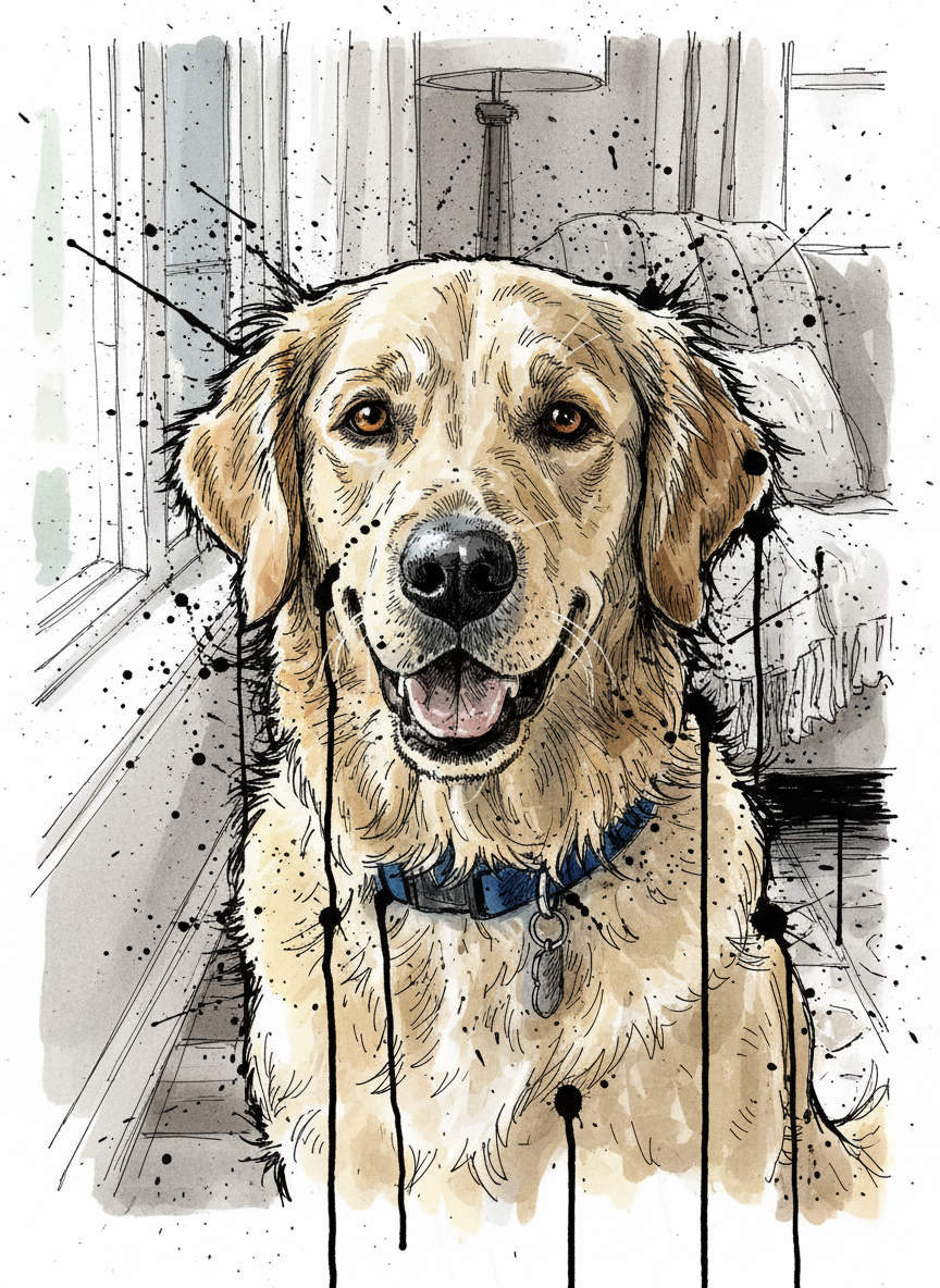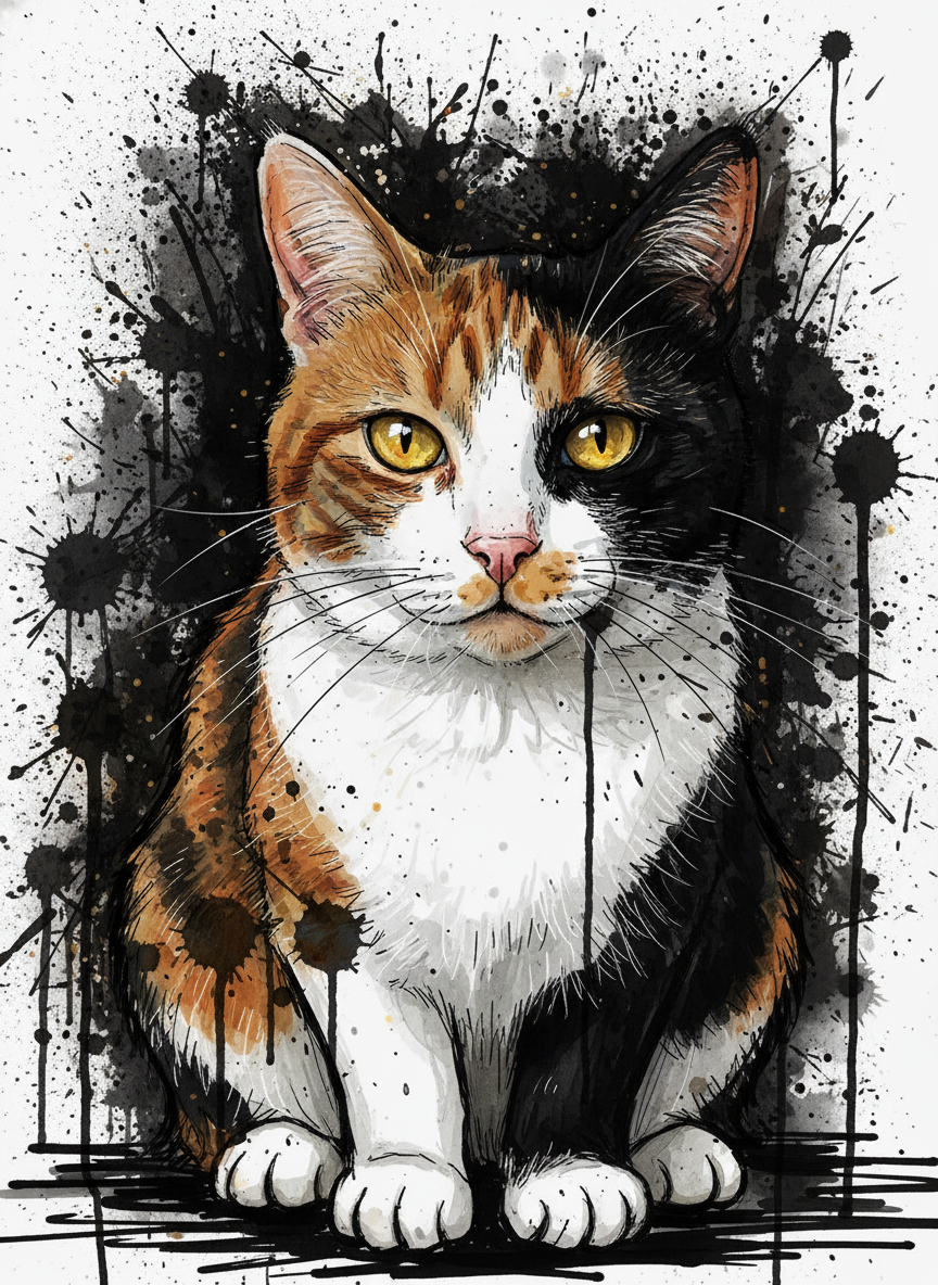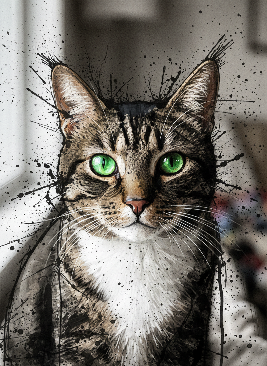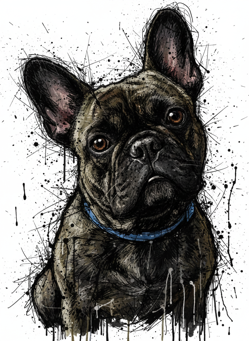 Ralph Steadman drew for Hunter S. Thompson, which tells you everything. Splattered ink, expressive distortion, the feeling of someone who has strong opinions and sufficient ink. Your pet rendered in that tradition: dark, expressive, alive with marks that go where they want to. Not cute. Not tidy. Unmistakably present.